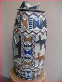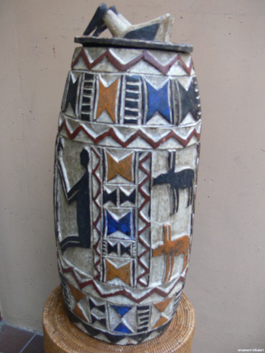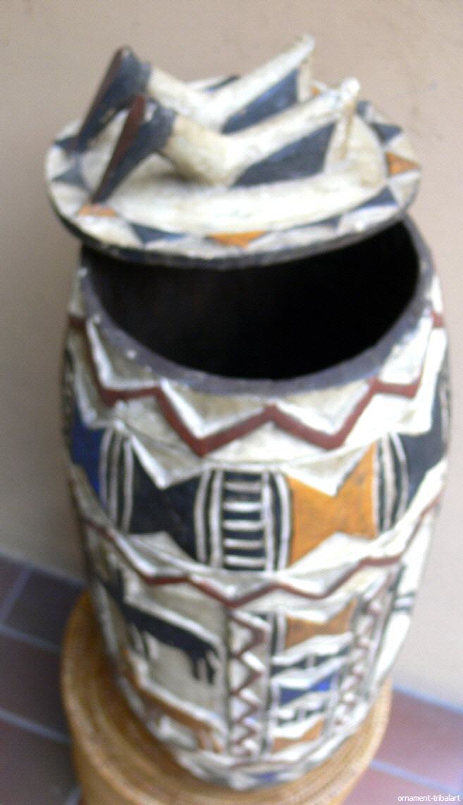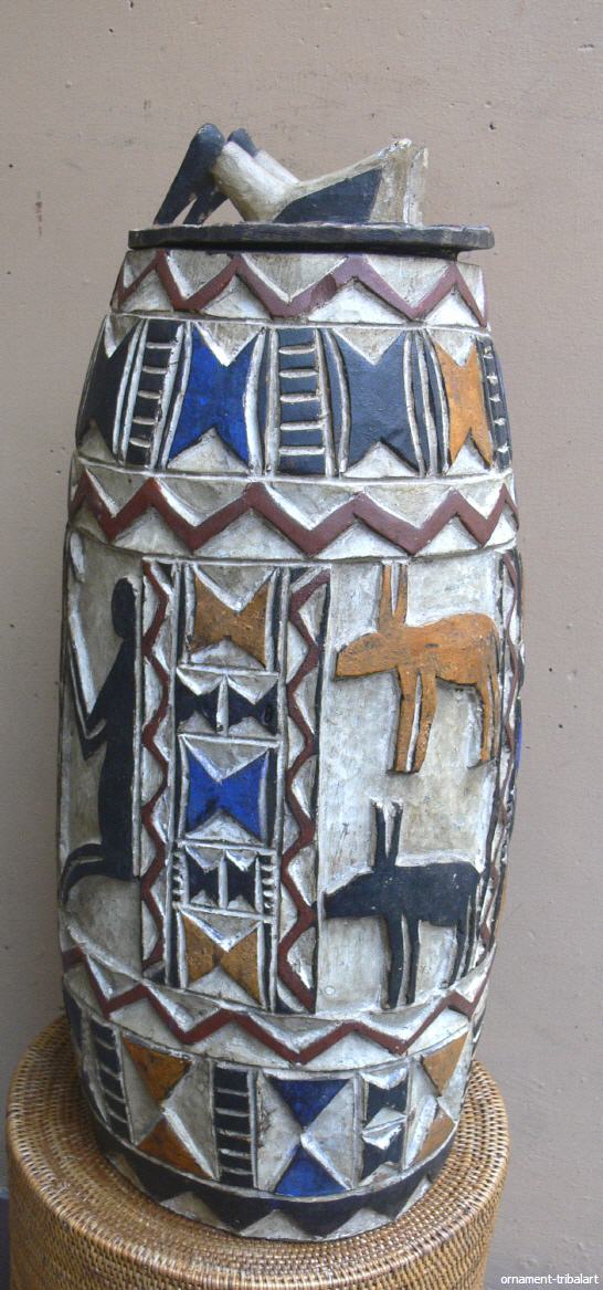 aus Tiebele, schöne Reliefschnitzarbeit, bemalt, Höhe 57cm, Durchmesser außen 24cm