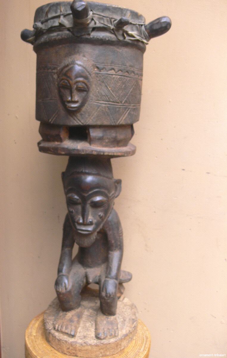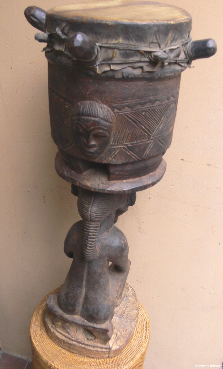 mit Trommel der Baule, Elfenbeinküste, kleine Holzabsplittung u. kleiner Spannungsriss im Sockel, sehr dekorativ, Höhe 73cm, Durchmesser 32cm