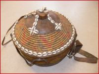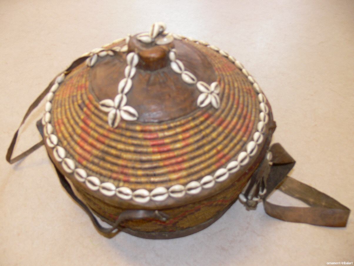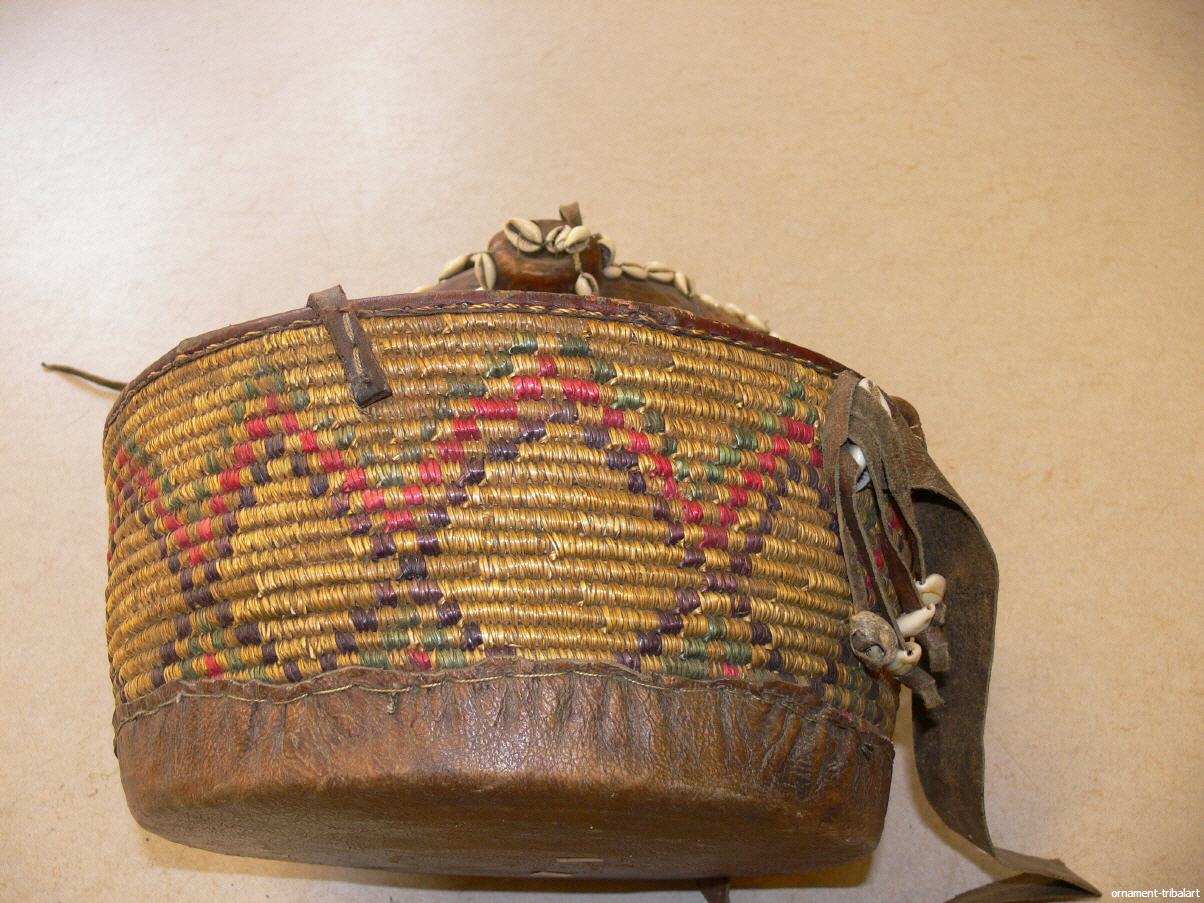 alte Grasflechtung, Lederapplikation mit Kaurimuscheln, Höhe 28,5cm , Durchmesser 32,5cm