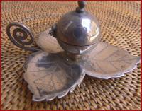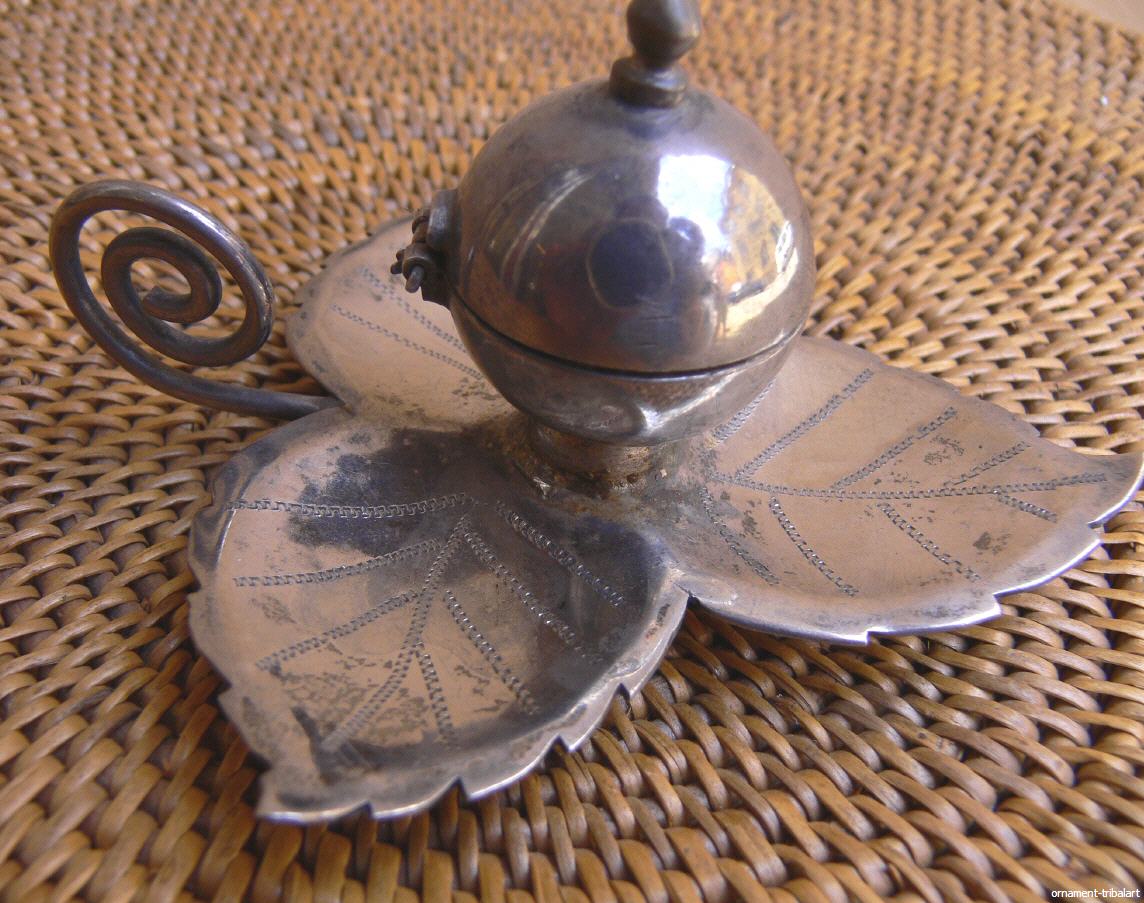 Silber , alt , Wüste Thar ,mit Schanier , unteres Teil in Form eines Blattes , Höhe 5 cm, Durchmesser mit Henkel 10 cm