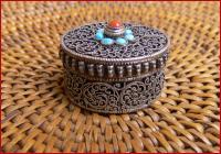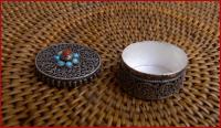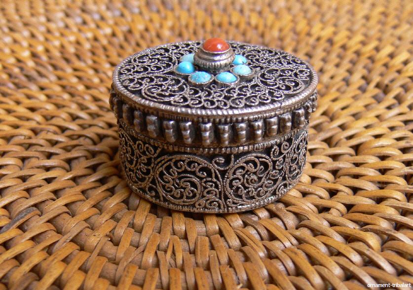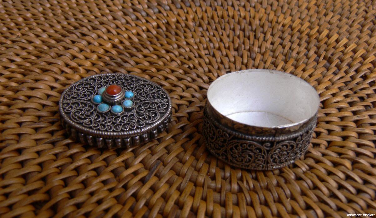 der Newar, Silber, Filigranarbeit mit Türkis u. Koralle, Länge 2,8 cm, Höhe 2,2cm, Tiefe 2,3cm