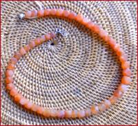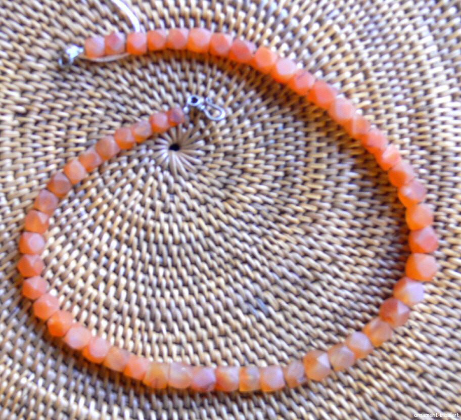 aus Karneol , unpoliert , facettiert , Drchmesser 0,7 - 0,9 cm , Länge 44,5 cm , auf Stahlseide , Silberverschluss