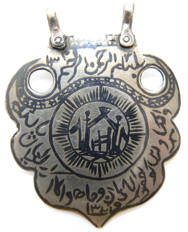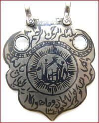alt , Silber , Niellotechnik , Koraninschrift , Höhe 4,7 cm , Breite 3 ,6 cm