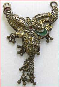 aus Silber leicht vergoldet u. emailliert , Gujarat , alt , Höhe mit Ketten 6 cm , Breite 3,8 cm