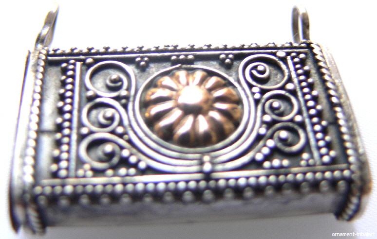 aus 925 Silber u. Gold , aufwendige Granulatarbeit , zum Öffnen , Höhe mit Ösen 2,4 cm , Breite 2,8