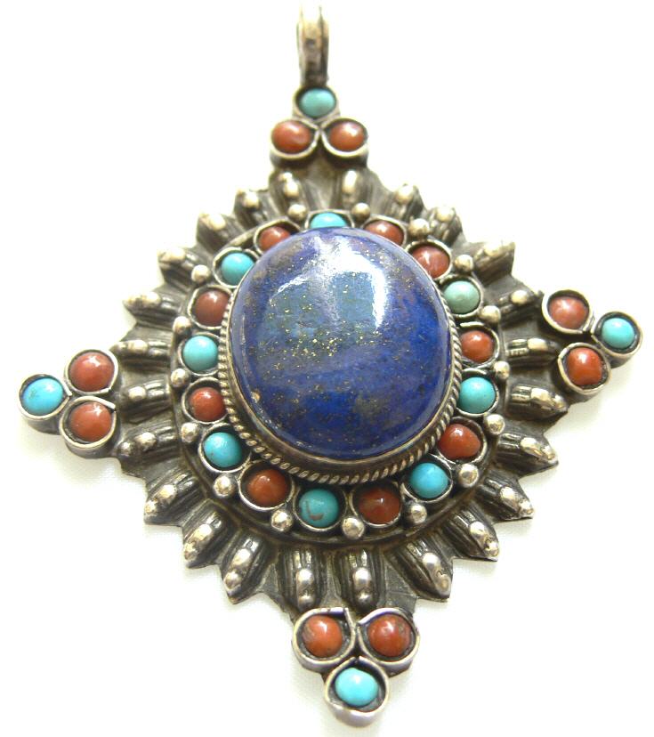 tibetisch , 925 Silber mit Koralle , Türkis u. Lapis , Doppelvajra , große Öse , Höhe 6,5 cm , Breite 5 cm