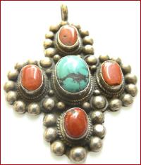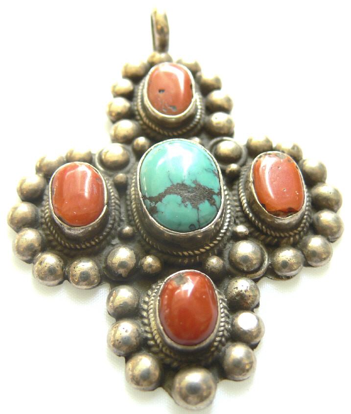 tibetisch, 925 Silber mit Türkis u. Koralle , Handarbeit , Doppelvajra , Höhe 6,5 cm , Breite 4,5 cm