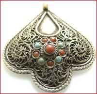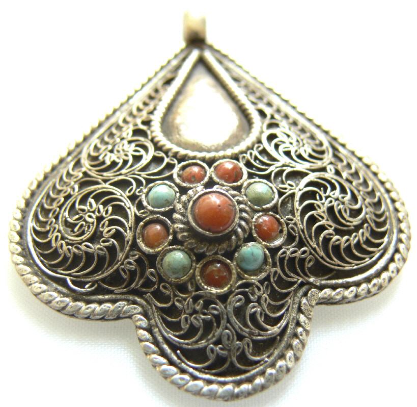 Arbeit der Newar , 925 Silber , mit Koralle u. Türkis , Höhe 4,6 cm , Breite 3,6 cm