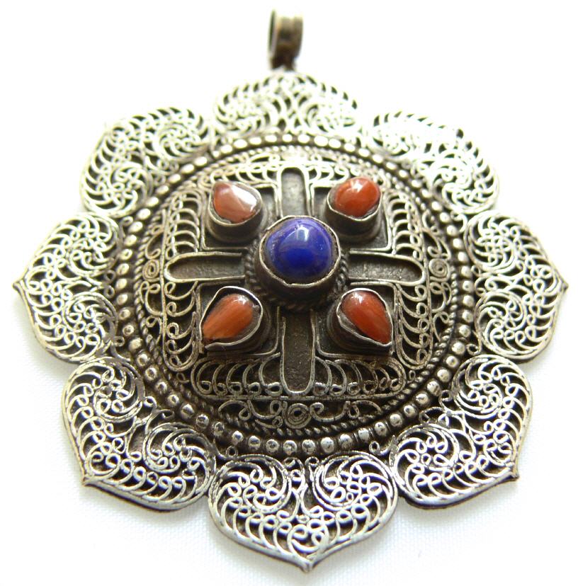 Arbeit der Newar , 925 Silber , mit Koralle u. Lapis , Höhe 5,2 cm , Breite 4,5 cm
