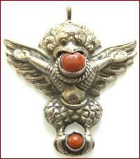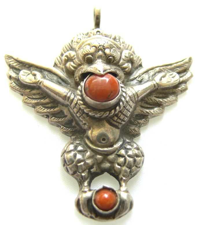 aus 925 Silber u. Koralle , Gott der Reisenden u. Kaufleute , Handarbeit , Höhe 5,1 cm , Breite 4,5 cm