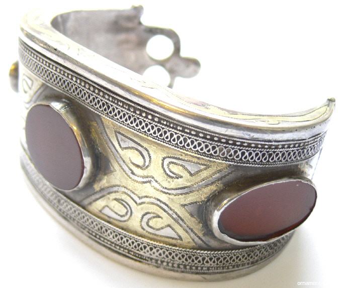 der Turkmenen , Silber feuervergoldet , mit Karneolen , älteres Stück , Öffnung 3,2 cm , Breite 3,6 cm , Umfang außen 17,8 cm , Stärke 0,7 cm