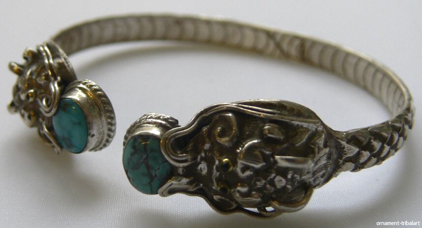 aus 925 Silber , mit 2 tibetischen Türkisen , biegbar , tibetische Handarbeit , Motiv 2 Drachen , Umfang ca. 19 cm , Breite 0,7 cm