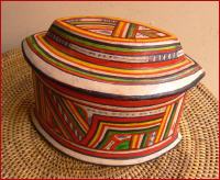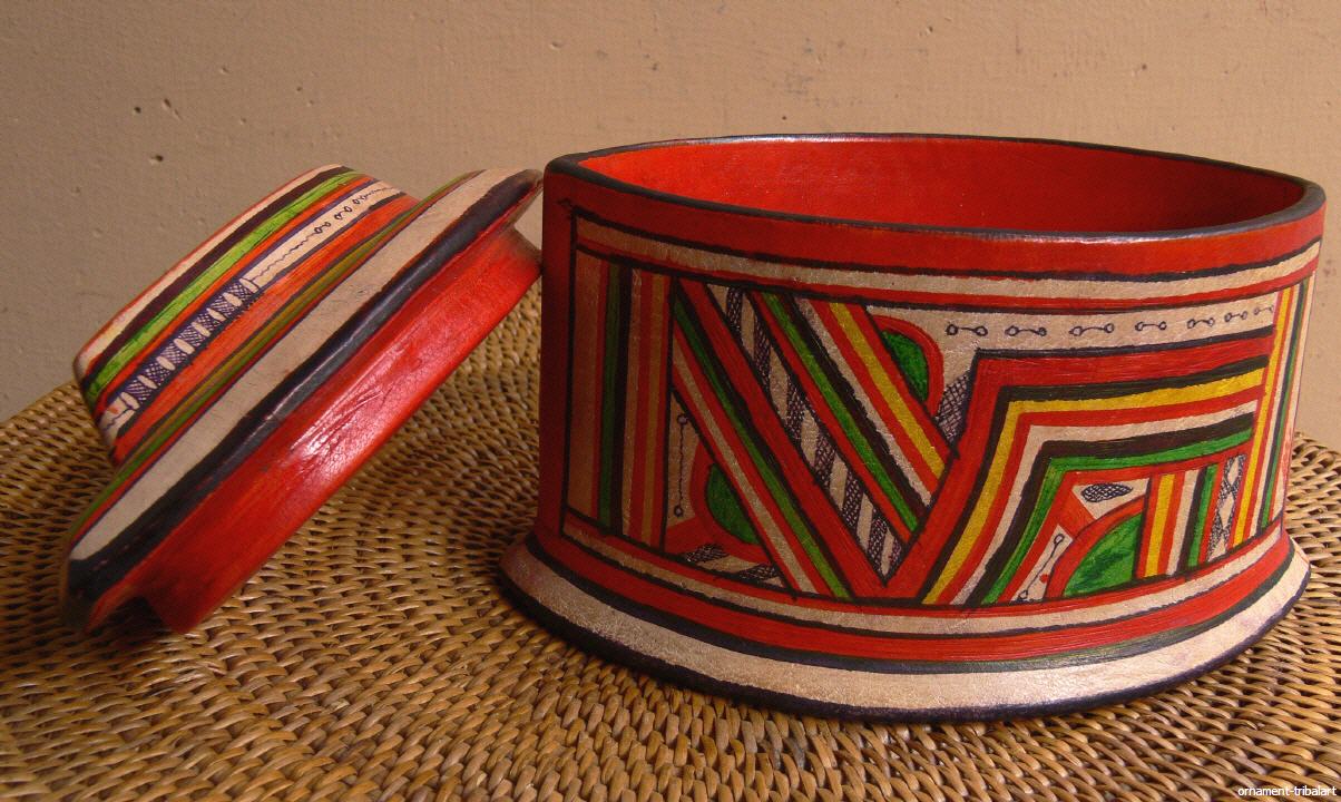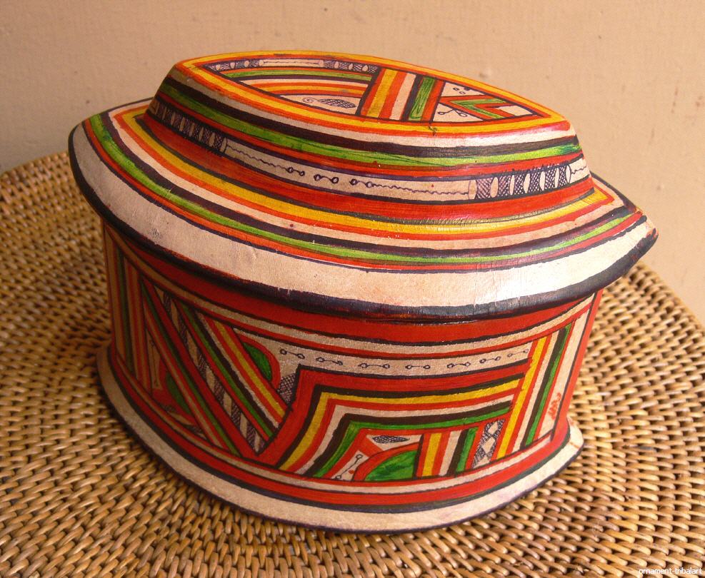 der Tuareg, Holz mit Ziegenleder innen u. außen bezogen, handbemalt, Breite 14 ,7 cm , Tiefe 8 ,7 cm , Höhe 10 ,3 cm