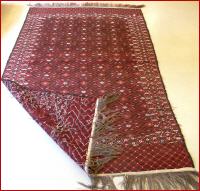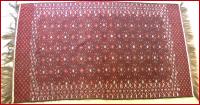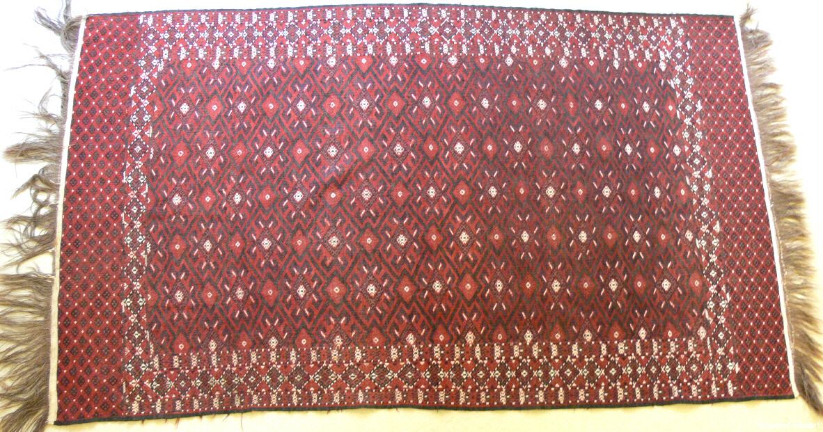 Jomude , Grundgewebe u. Kette Wolle , Einwirking Wolle u. weiße Farbe Baumwolle , älter , 242 cm auf 130 cm