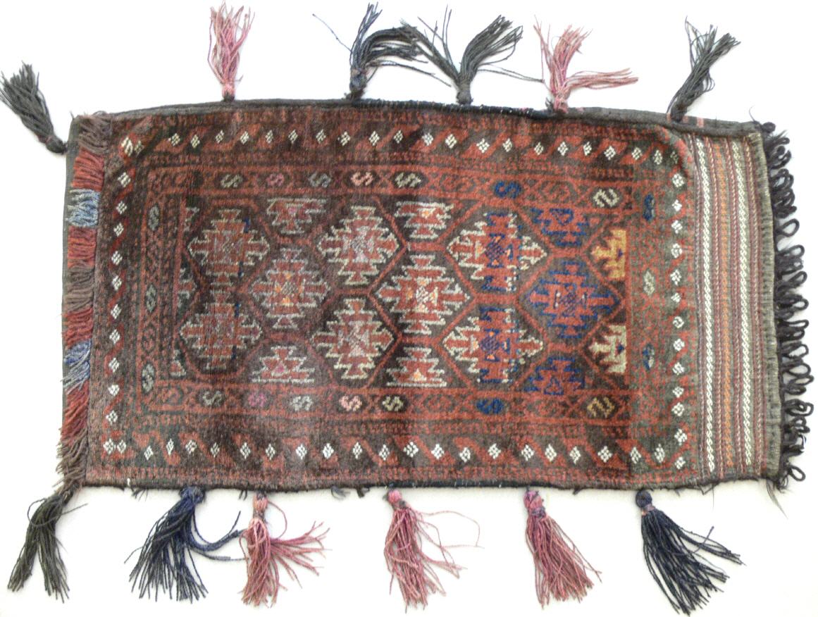 der Belutsch , Wolle , geknüpft , alt , Rückteil original , durchgewoben , Naturfarben , 115 cm auf 62 cm