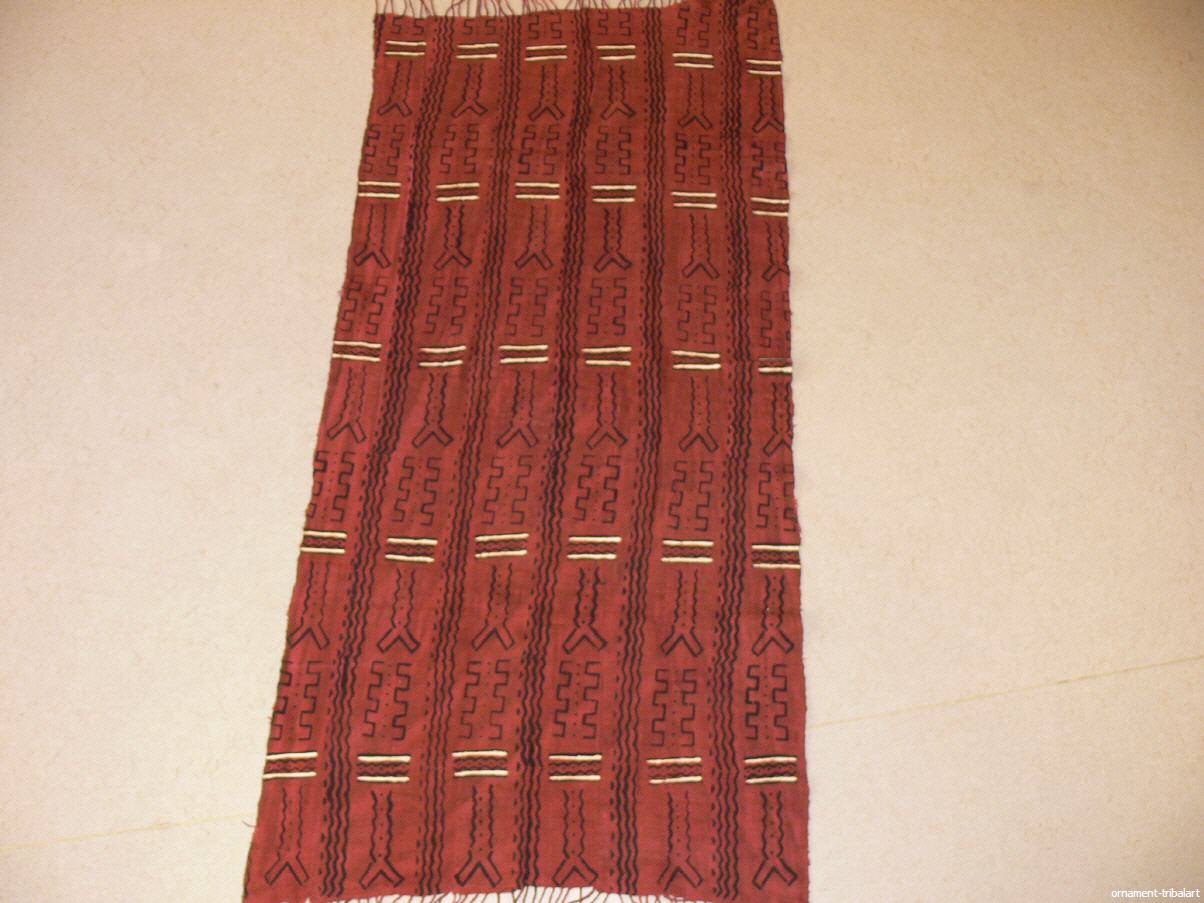 aus handgewebten Baumwollstreifen zusammengenäht, mit Naturfarbe gefärbt u. hadbemalt, 68cm auf 144cm