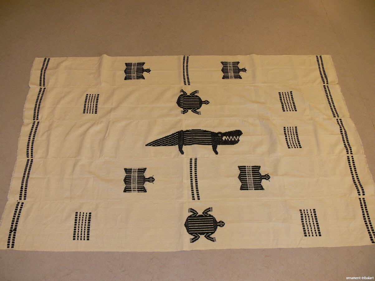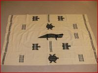 handgewebte Streifen aus ungebleichter Baumwolle zusammengenäht u. mit heiligen Tieren bestickt, 90,5cm auf 137 cm
